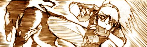 ざくろは舌打ちをして、足を戻した。その時、ざくろの頭の真上に再びワープドッグが出現し、そのまま頭の上に落ちてくる。・・・「落ちてくる。」というか、アタックをかまして来た。ざくろは地面に片足を付いたが、すぐに体勢を戻して凄い勢いで僕達の方に走ってきた。ワープドッグから3m程離れた時点で、ざくろは走る勢いを弱め、普通に僕達の所へ走ってくる。