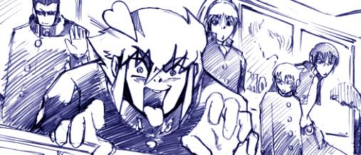 何だか、トレンディードラマのシーンに使われそうな綺麗な事務所で、5.6人の従業員らしい人が机で電話したり、書き物をしたりしていた。『〜している。』と書かないのは、俺達が事務所に入るなり、従業員風の人達の手が止まったんだ。…まぁ分からないでもないけど、いきなり短ラン、長ラン姿で、金髪、赤髪、灰色髪の連中が入って来たんだから仕方が無い。ちなみに雅は『黒髪』。太郎は『茶髪』で、そう珍しくも無いけどね。・・・と、まぁ、俺達があいさつをして振り向いてくれる時間は短縮されたわけだ。