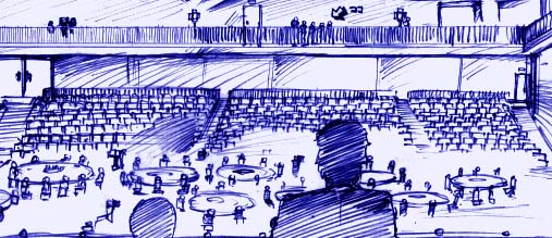 お目にかかれない俳優さん達だから、その人達を見れるだけでも来た甲斐があった。森繁久弥さん、木の実ナナさん、上沼恵美子さんといったかなり年配の芸能人の人がいると思えば、観月あさりちゃん、空香ちゃん、深田笑子ちゃんといったアイドルの姿もある。そして、3年前に日本国籍を取って日本でドラマや映画に大活躍中のレオナルド・ディカプリオさんの姿もあって、ものごっつう凄過ぎの会場なのだ。…で、そのテーブルの後ろには階段状に客席が並んでいて、来賓や関係者の人が座っている。今回の収録は一般人のお客は入れないんだって。俺達、ラッキー。ほんでもって、階段状の客席の登り切ったところに大きな扉が2箇所、デンと構えてる。こんな会場で、いよいよ『日本アカデミー賞』が始まったんだ。