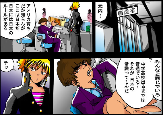 「元内。アメリカ育ちだか知らないが、お前の素行は悪すぎる。日本には日本のルールってもんがあるんだ。ファッションうんぬんなんて、大人になってからやる事。」